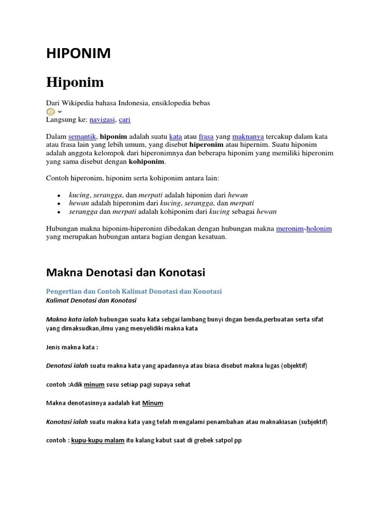 50 hipernim dan hiponim beserta kalimatnya, contoh kalimat hipernim dan hiponim, hiponim dan hipernim terkait satu sama lain. hiponim (dari bahasa yunani hupó, "di bawah" Suatu hiponim adalah anggota kelompok dari hiperonimnya dan beberapa hiponim yang memiliki hiperonim yang sama disebut dengan kohiponim. contoh kalimat hiponim dan hipernim. Kata hipernim adalah kata yang memiliki makna luas mencakup makna kata lain yaitu hiponim.